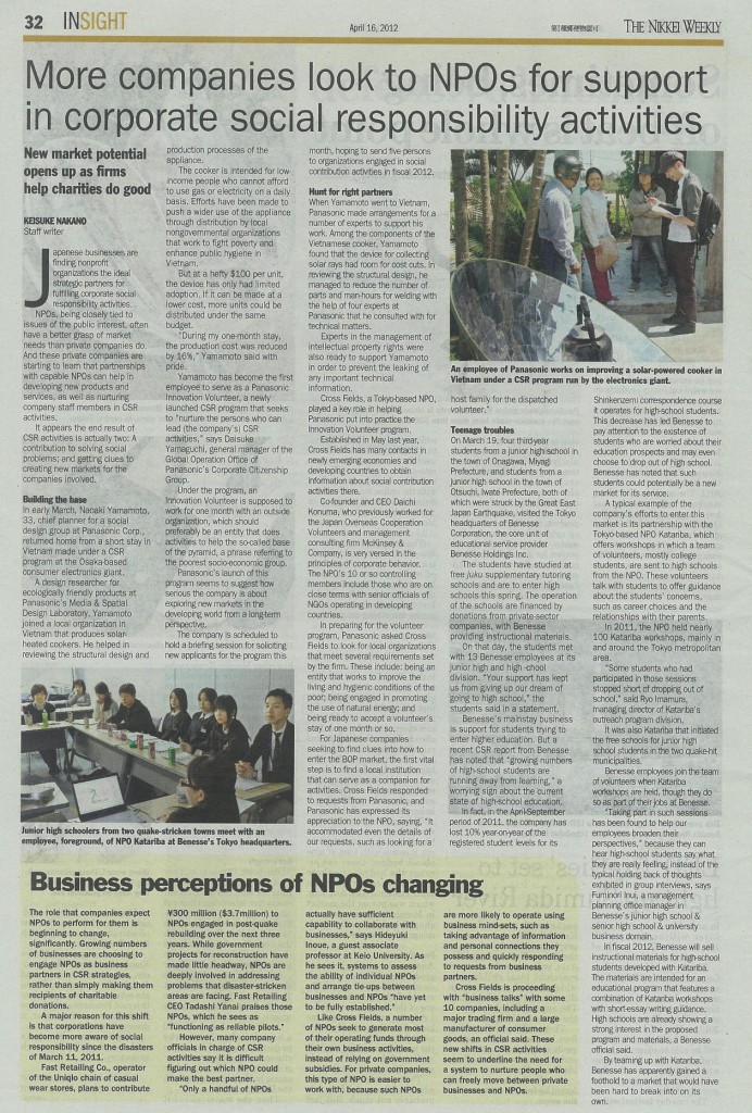 4/16(月)のThe Nikkei Weeklyにパナソニックとの協働についての記事が掲載されました