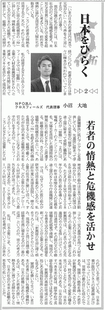 日経新聞夕刊一面にクロスフィールズ「留職」プログラムを活用したパナソニックの事例が取り上げられました(日本経済新聞)