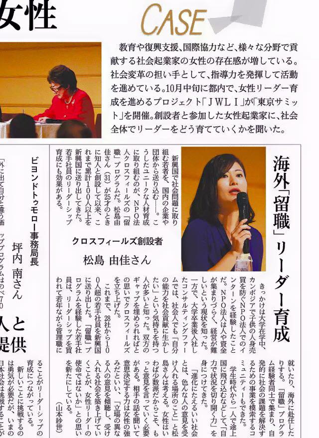 【メディア】11/5(土)日本経済新聞朝刊31面「社会起業家 いでよ女性」特集にて”海外「留職」リーダー育成”(NPO法人クロスフィールズ副代表 松島由佳インタビュー記事)掲載いただきました