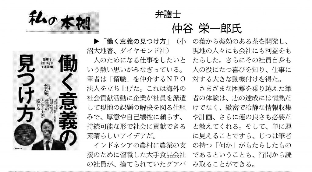 【メディア】 11/4(金)日経産業新聞18面「私の本棚」にて『働く意義の見つけ方-仕事を「志事」にする流儀』(ダイヤモンド社/小沼大地著)をご紹介いただきました(弁護士・仲谷栄一郎様ご推薦)