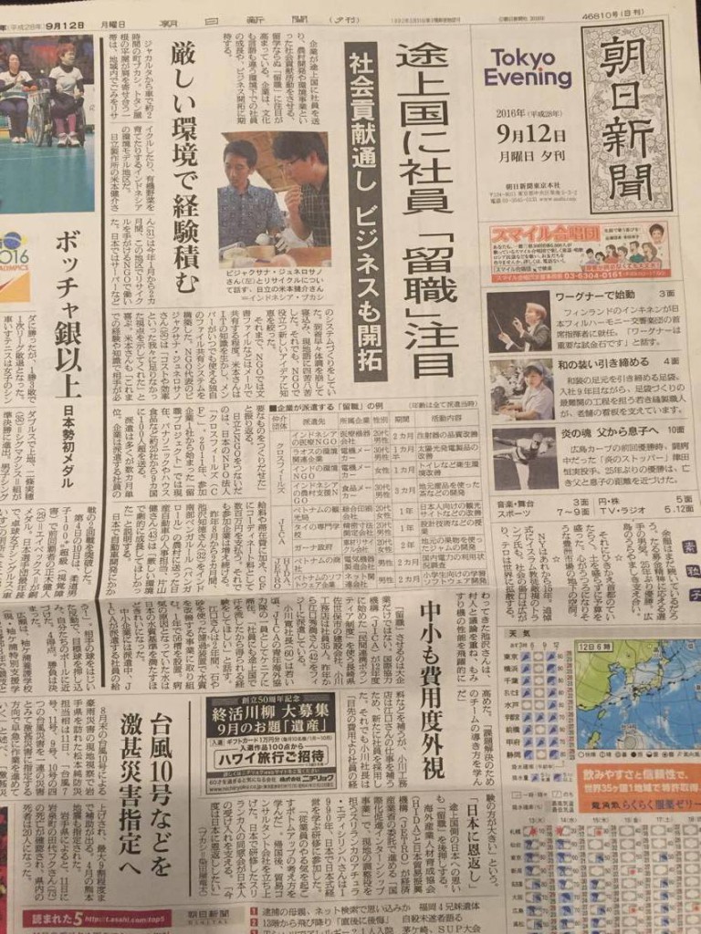 【メディア】朝日新聞夕刊1面 『途上国に社員「留職」注目 社会貢献通し ビジネスも開拓』(9/12(月))