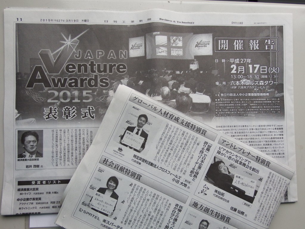 3/18付の日刊工業新聞に「Japan Venture Awards 2015」受賞式の模様が掲載され、クロスフィールズも紹介されました