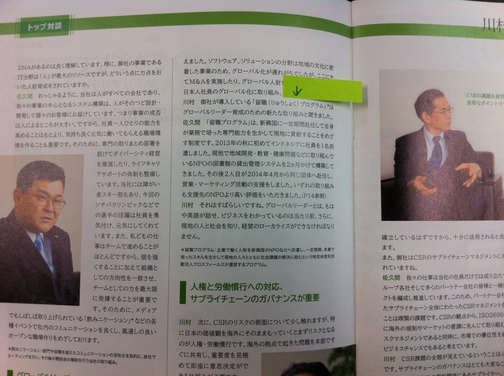 日立ソリューションズさんのCSR報告書2014に留職プログラムを取り上げて頂きました