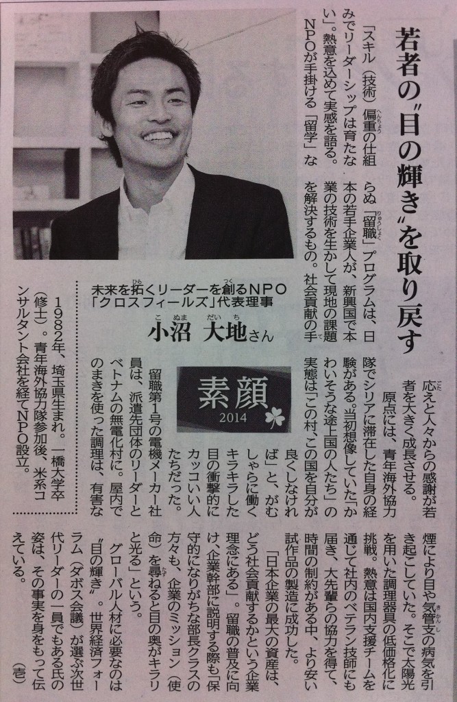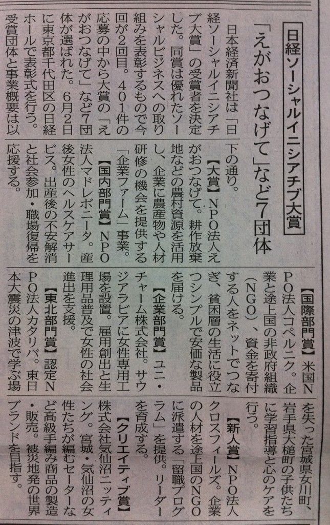 4/24(木)日経朝刊掲載、第2回日経ソーシャルイニシアチブ大賞・新人賞を受賞