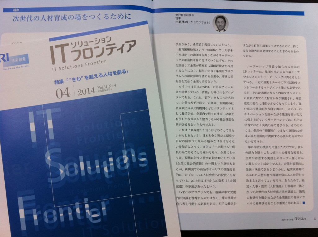野村総合研究所の月刊誌『ITソリューション フロンティア』に「留職」が取り上げられました