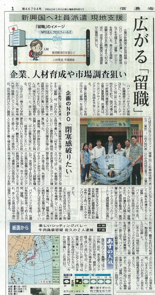 9/5(水)の信濃毎日新聞夕刊一面に「留職」に関する記事が掲載されました